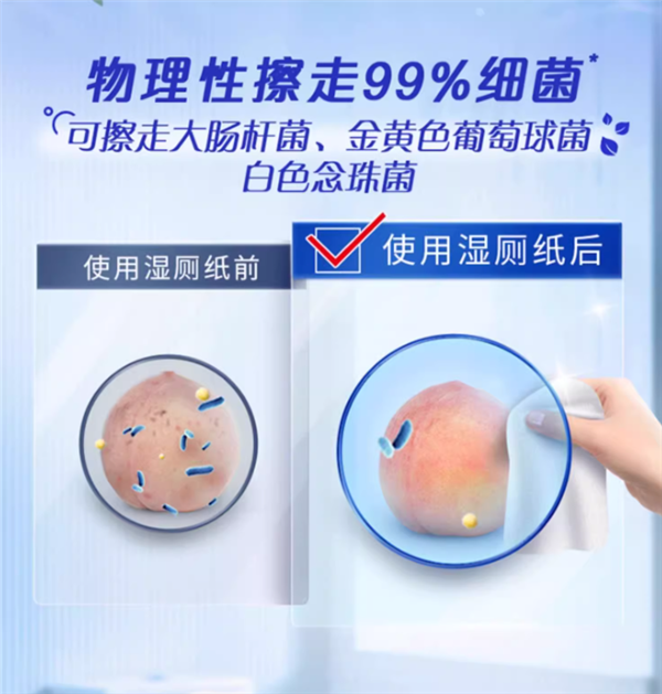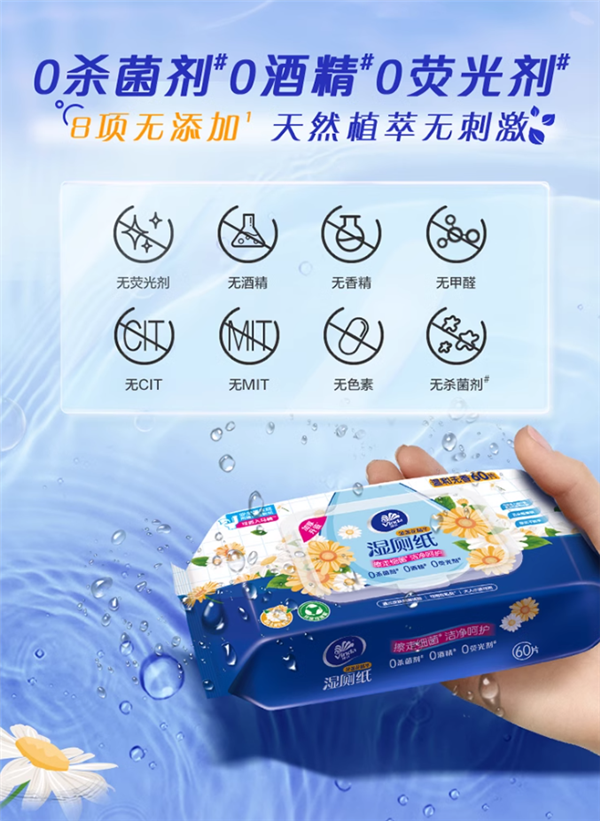 0酒精+0荧光剂,用后可直接丢入马桶中。含金盏花精华温和无香。物理性擦走99%细菌。