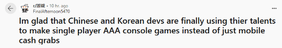 Reddit论坛上有网友发布热帖称,“我很高兴看到中国和韩国的开发者们做出单机3A游戏,而不仅是氪金手游”。