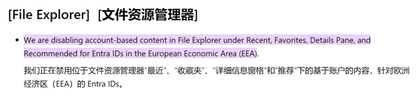 在支持文档中,微软确认将禁用具有欧洲经济区Entra ID用户的文件资源管理器中的基于账户的内容。