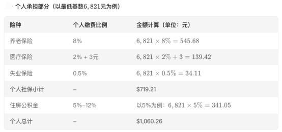 以北京为例,按北京参保企业职工的月缴费基数下限6821元计算,企业为骑手缴纳五险一金,企业自身缴纳比例约为工资基数的30%,骑手个人承担的部分(养老8%、医疗2%、失业0.5%、公积金5%-12%)约在1000元-1500元。