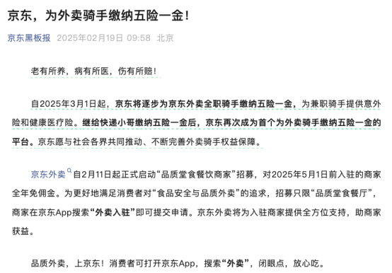 紧接着,在19日上午,京东又祭出一记重拳:宣布自2025年3月1日起,京东将逐步为京东外卖全职骑手缴纳五险一金,为兼职骑手提供意外险和健康医疗险。开始抢骑手。