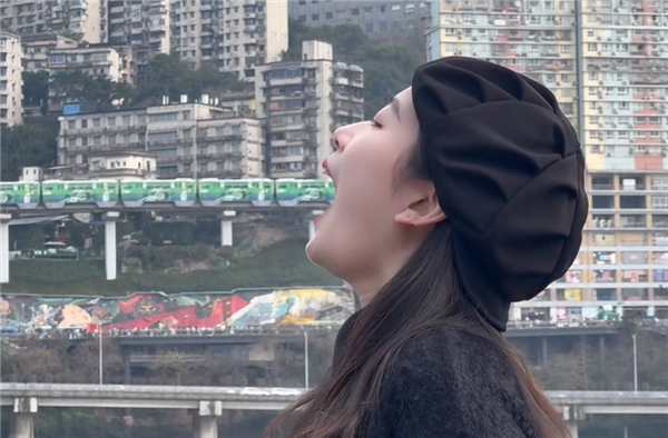 网友发布视频中,有人隔江站在李子坝轻轨站对面,等到轻轨经过时张嘴,利用错位效应,轻轨像是被吃进嘴里一般,很是好玩有趣。
