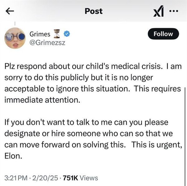 Grimes在X上表示:“请回应我们孩子的医疗危机。我很抱歉公开这样做,但忽视这种情况已经不能接受了。这需要立即关注。”