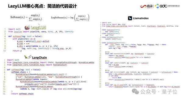 例如用代码表达一个数学公式,对比LazyLLM、LangChain和LlamaIndex,LazyLLM的代码是真的短了不少: