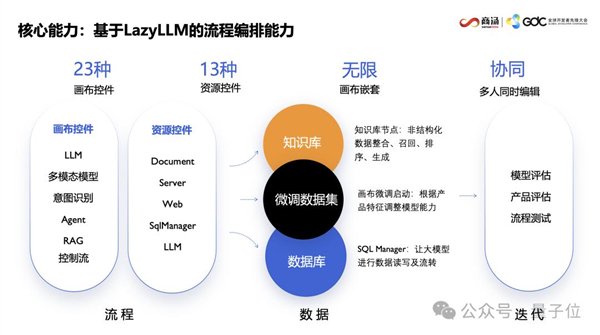 其次,正是因为基于LazyLLM,万象应用开发平台通过统一画布界面,将LLM应用开发、RAG核心算法及多模态模块编排整合,支持用户灵活组合算法组件、即时测试调整,并一键启动微调服务,实现高效便捷的流程编排能力。