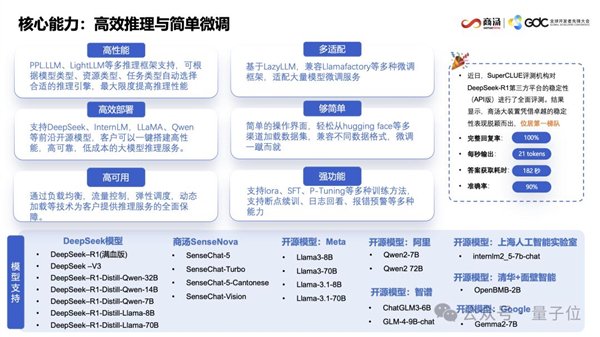 不仅支持PPL.LLM、LightLLM等多推理框架,在这里,你还可以一键搭建各种主流大模型,包括大火的DeepSeek满血版、商汤SenseNova,以及Meta、阿里、智谱等众多开源模型!