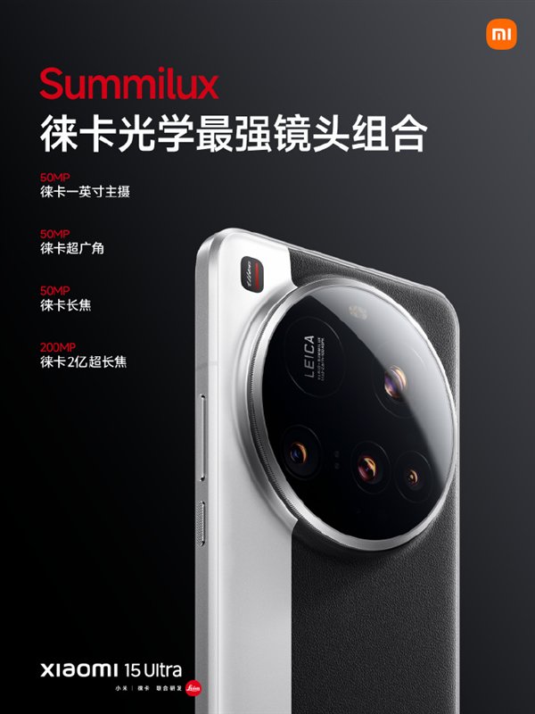作为小米最强影像旗舰,小米15 Ultra代号“夜神”,搭载徕卡光学最强镜头组合,四颗镜头分别为5000万像素徕卡1英寸主摄、5000万像素徕卡超广角、5000万像素徕卡长焦、徕卡2亿像素超长焦镜头。