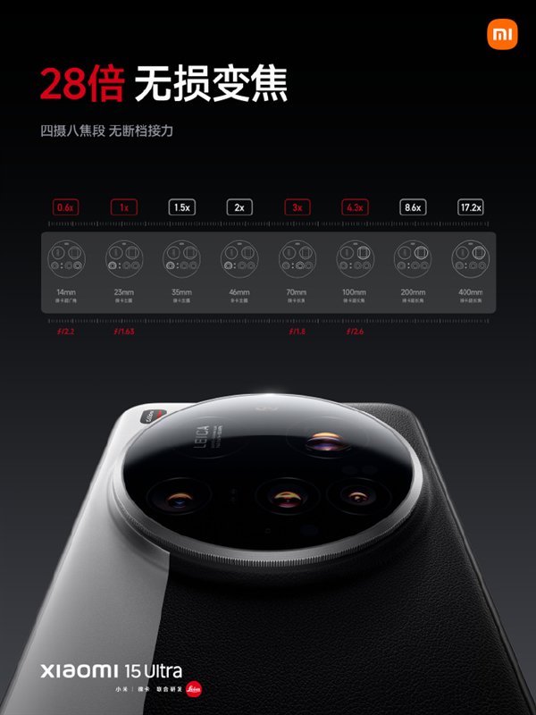 小米15 Ultra号称“口袋里的大三元”,四摄八焦段,无断档接力,支持28倍无损变焦。