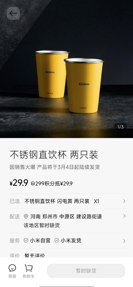截稿前,小米汽车App显示,该不锈钢直饮杯已为“暂时缺货”,详情页称因销售火爆,该直饮杯将于3月4日起陆续发货。