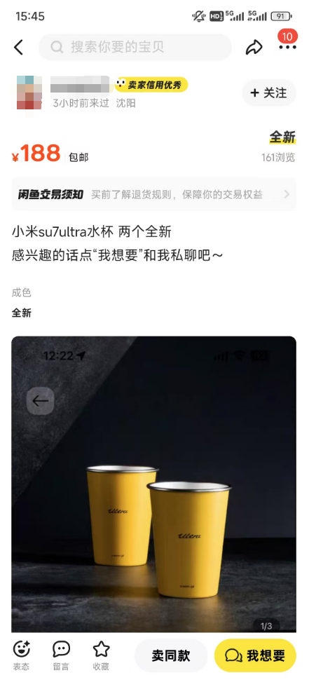 同时,小米还推出了SU7 Ultra同款闪电黄配色的不锈钢直饮杯,两只装售价29.9元。
