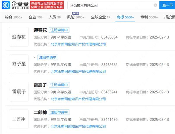 快科技2月28日消息,企查查APP显示,近日,华为技术有限公司申请注册“Wukong”“二郎神”“雷震子”等多个新商标。