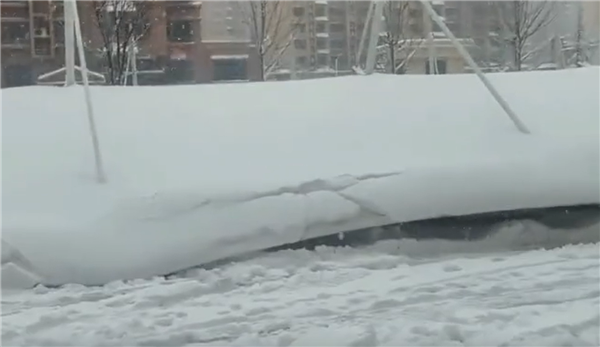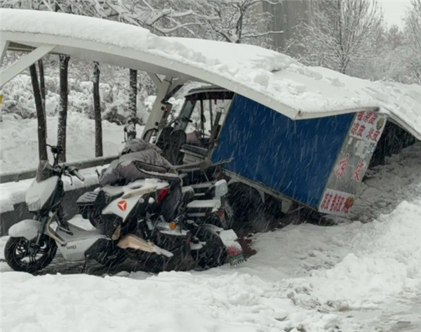 近日,山东滨州迎来大降雪,在某小区内电动车充电区域的顶棚被雪压倒,砸了下来。