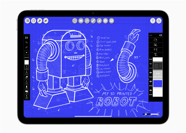 iPad 11可选银色、蓝色、粉色、黄色四款配色,Wi-Fi版重477克,eSIM版为481克,采用集成指纹的顶部按钮(触控ID传感器)。