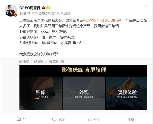 快科技3月11日消息,OPPO周意保开始预热OPPO Find X8 Ultra,他表示,OPPO Find X8 Ultra产品亮点实在太多了,如果只用三句话来介绍这个产品,我用会这三句话。