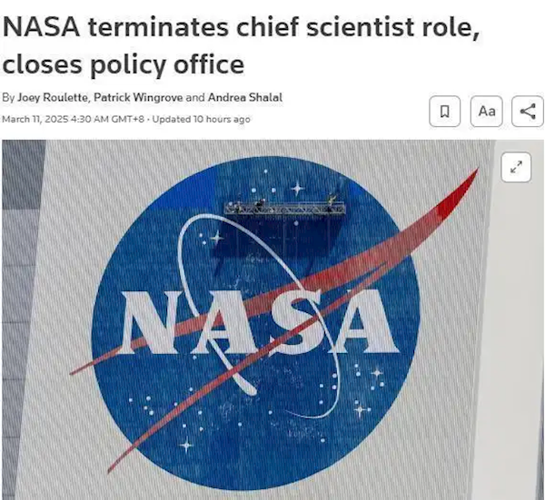 报道称,此次裁员是美国新一届政府削减成本计划的一部分,包括美国宇航局现任首席科学家凯瑟琳·卡尔文博士将离职。