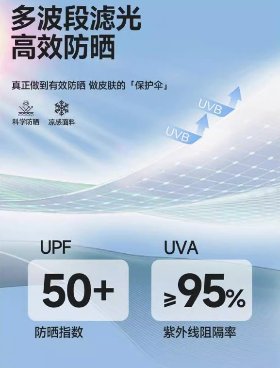 防晒指数UPF50+,紫外线阻隔率>95%。