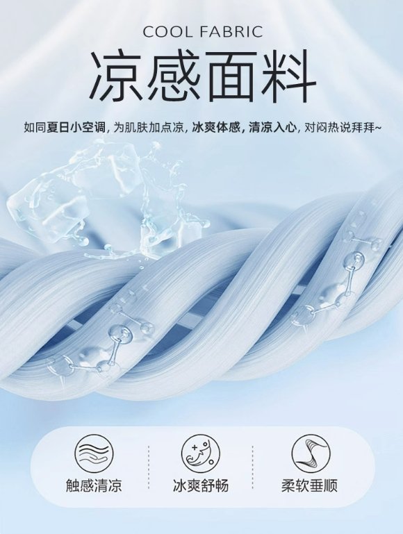 面料经凉感科技处理,能迅速吸收皮肤表层湿气及汗水,扩散并迅速蒸发,从而保持体感持久干爽舒适。
