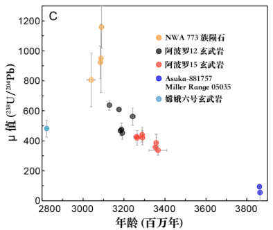 低钛玄武岩形成年龄与μ值关系图 · 来源地质研究所成果快讯