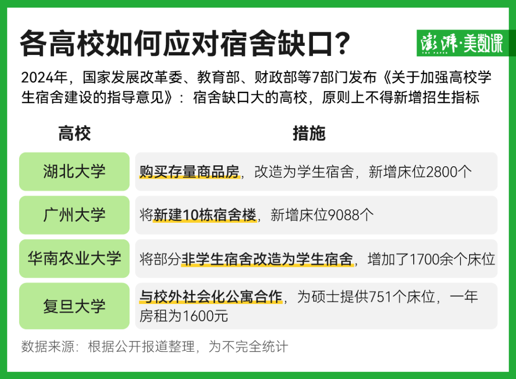 还有高校如华南农业大学,选择在校内用“补充”“腾挪”的方式增加床位,通过新建宿舍楼、将部分非学生宿舍改造为学生宿舍,增加床位3500余个。2024年,多所高校如南京大学、广州大学宣布进行宿舍扩建。