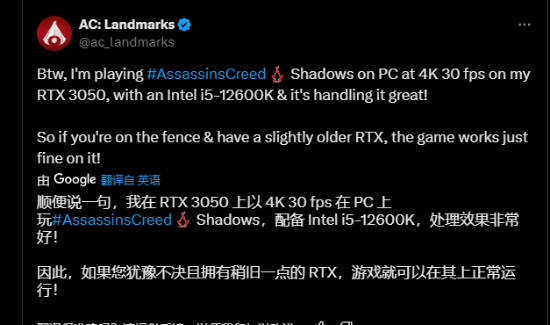 而近日游戏博主@ac_landmarks在推特发文透露,他使用Intel i5-12600K、RTX 3050的PC配置运行本作,可以达到4K 30FPS!因此他表示:“如果您拥有稍旧一些的RTX,那么游戏就可以正常运行!”