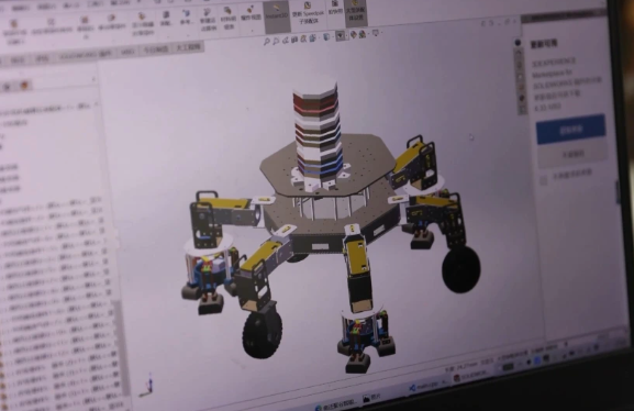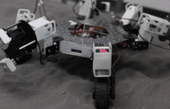 经过在沙盘上的反复训练,太空采矿机器人已能够通过六足差动系统悬架、离合器等协同工作,根据工作环境调整自身结构形状,以应对地外星体复杂多变的地表环境。