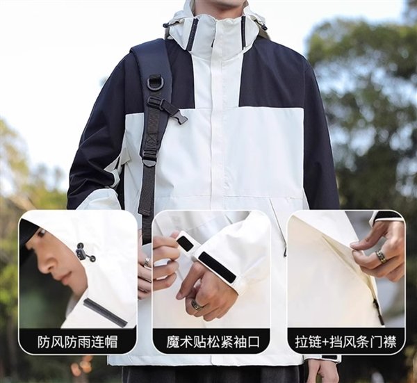 防风防雨连帽+魔术贴松紧袖口+拉链+挡风条门襟。高透湿,高透气,防雨的同时保持透湿透气不闷汗。经过科学的技术处理。表面形成后水层,产生荷叶拒水效应水成珠,表层滚落。