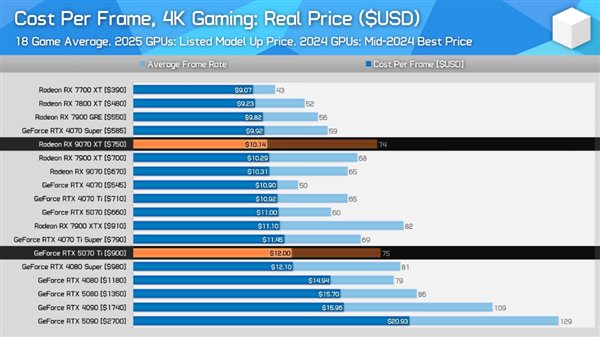 在18款游戏测试中,RX 9070 XT平均帧率为74 FPS,按照600美元的官方售价计算,每FPS仅需8.11美元,RX 9070也才每FPS 8.46美元。