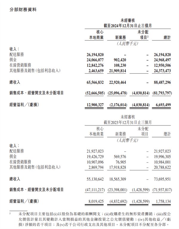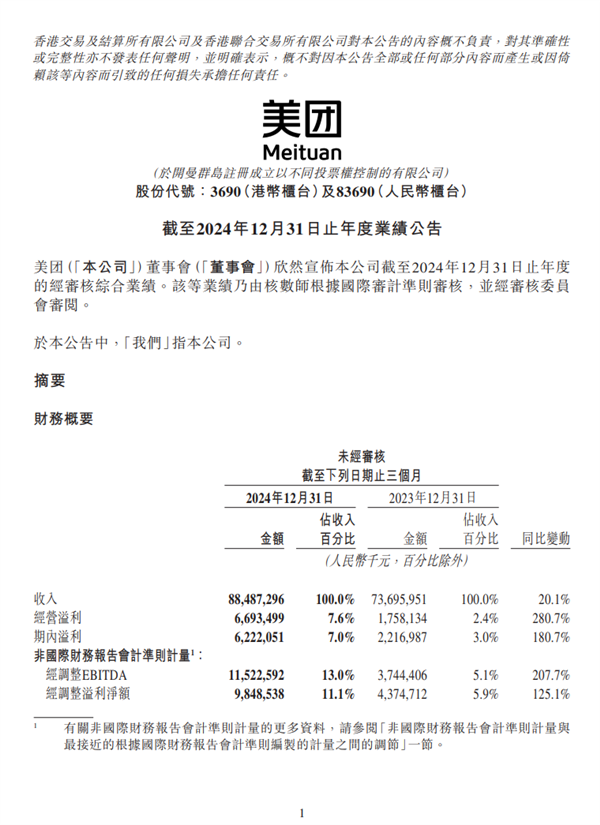 第四季度,美团营收885亿元,同比增长20.1%,净利润为62亿元,而2023年同期净利润为22亿元;非国际财务报告会计准则计量,调整后的净利润为98亿元,2023年同期净利润为44亿元。