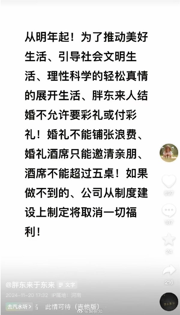 去年11月20日,于东来在个人社交平台发文表示,从明年起,“胖东来人结婚不允许要彩礼或付彩礼;婚礼不能铺张浪费,婚礼酒席只能邀请亲朋,酒席不能超过五桌”。