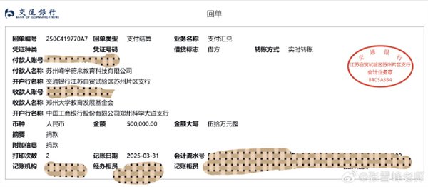 他晒出四张打款账单,分别是苏州教育基金会100万、张雪峰母校郑州大学50万、黑龙江省教育基金会50万、哈尔滨理工大学25万,共计225万。