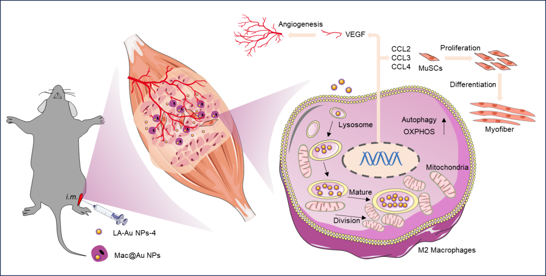 骨骼肌再生涉及一系列复杂的生物学过程,依赖于巨噬细胞与肌肉干细胞(Muscle stem cells, MuSCs)之间的相互作用,其极化状态,即M1(促炎态)和M2(抗炎态),显著影响修复再生效果。然而,如何有效调节巨噬细胞免疫极化增强肌肉再生,一直是该领域的难题。