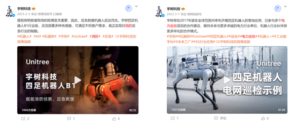 这还仅仅是消费级的 Go2 ,稍加改造生产力就已经够强了。。。而用于工业的 B 系列性能会更好,也支持更多的扩展,宇树科技早在 2023 年就发过 B1 参与消防救援、电力巡检的微博了。