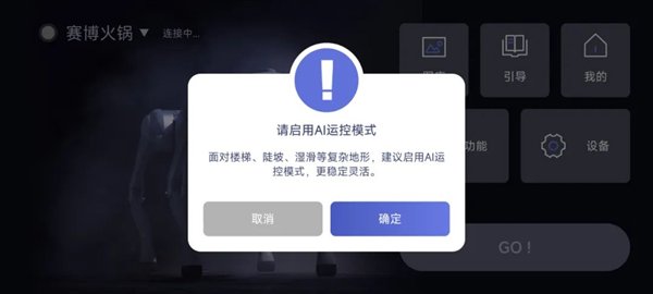 好在后来我们发现了 App 里有相关的提示,启用 AI 运动控制模式可以让它更稳定灵活。合着翻车是因为没有 AI 赋能是吧?