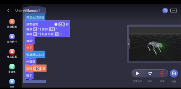 在编程的界面里,可以看到宇树给预设了两个 Sample ,这里可以精细地控制机器狗的动作,最高可以精确到每一度、每半秒,整个编程的交互也非常人性化,可以拖拽拼接每一个动作,右边还能预览,有点像是更精细的米家自动化。