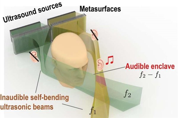 研究人员利用两个搭配声学超构表面(Acoustic metasurfaces)的超声波换能器,发射两道能够自弯曲并最终在某一点相交的非线性超声波束。