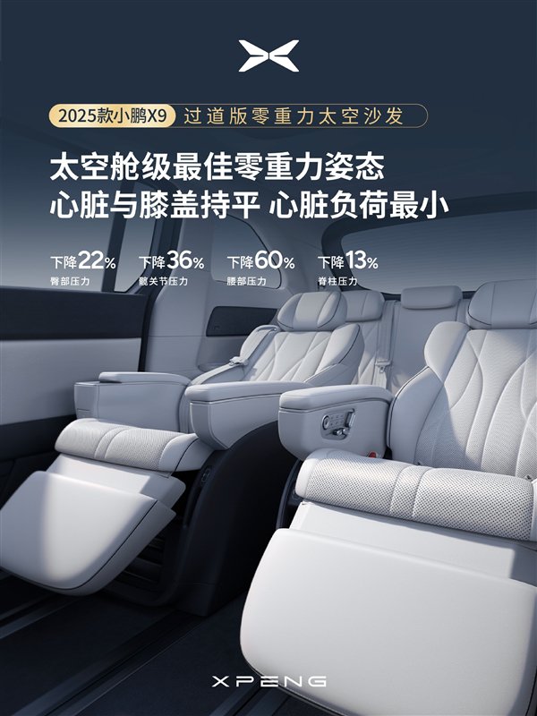 新款小鹏X9推出过道版零重力座椅,可以让臀部压力下降22%、髋关节压力下降36%、腰部压力下降60%、脊柱压力下降13%,即便是前排坐人时也能开启零重力,并且根据前排座椅姿态,可自动调节零重力角度。