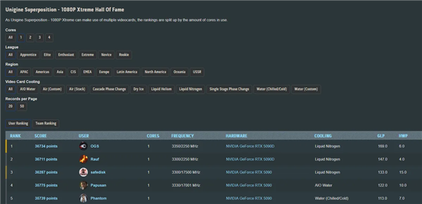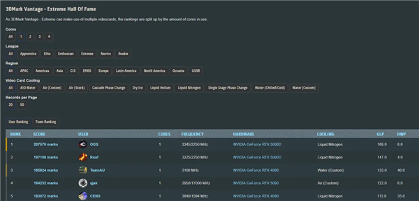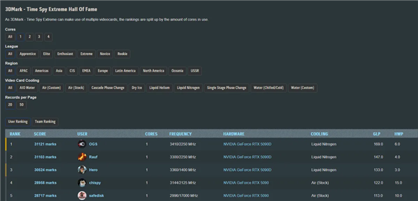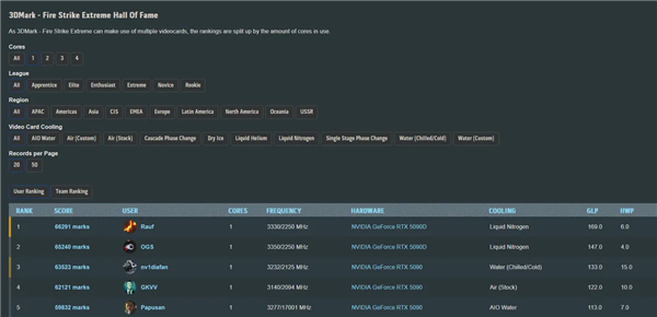 这些成绩大多由知名超频爱好者OGS和Rauf使用影驰RTX 5090D HOF OC LAB取得,并且采用了液氮冷却。