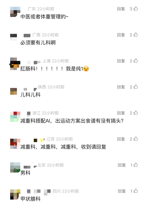 同时,网友还喊话希望更多科室加入,其中男科、肛肠科、皮肤科、减重等科室呼声最高。