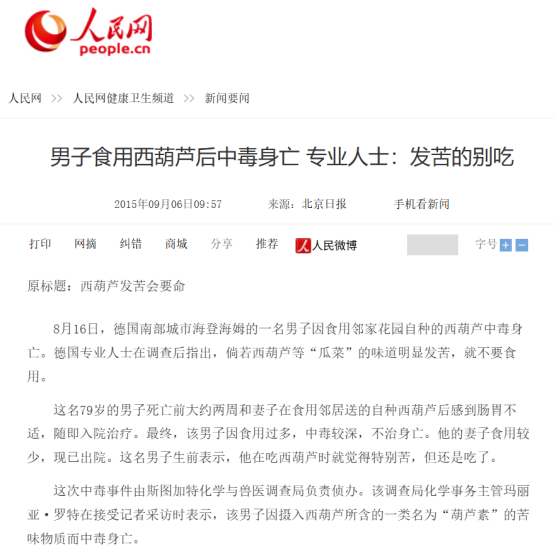 2020 年,发表在《德国医学周刊》上的一篇报道称:一名 66 岁女性患者在摄入有苦味的西葫芦后,因出现心动过速、低血压、嗜睡以及干燥、恶心、呕吐和便血而被送往急诊室。经医生诊断是因食用含葫芦素的发苦西葫芦引起的急性食物中毒并伴出血性结肠炎。