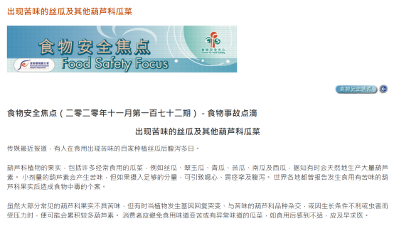 香港特别行政区政府食物安全中心也特别提醒过:葫芦科果实可能会含有大量葫芦素,有苦味的葫芦科果实摄入过多会引起身体不适,应避免食用味道变苦或有异常味道的瓜菜。[10]