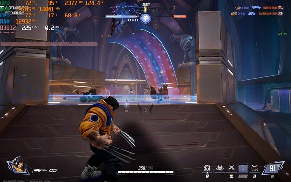 最后测试的是《漫威争锋》,开启DLSS4 4X。这款游戏同样没有Benchmark,所以帧数以实际游戏中的为准。在极高画质下,实际游戏团战中的帧数在220帧左右。