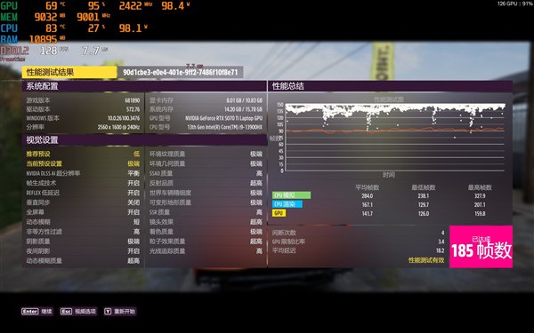 再次测试的是《极限竞速:地平线》,开启帧生成,选择极端画质,最终测试得到的平均游戏帧数是185帧。