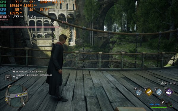 再次测试的是《霍格沃兹之遗》,开启DLSS4 4X。由于这款游戏没有Benchmark,我们就看实际游戏中的帧数表现。将画质设置为超高,可以看到游戏中的帧数可以稳定在250-280帧之间。