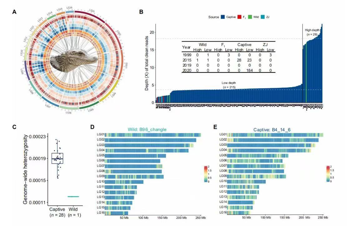 研究人员基于29个扬子鳄个体的基因组数据并通过更大样本量的研究分析,发现圈养种群的基因组杂合度高于野生个体的杂合度,表明圈养种群的遗传多样性高于野生个体。
