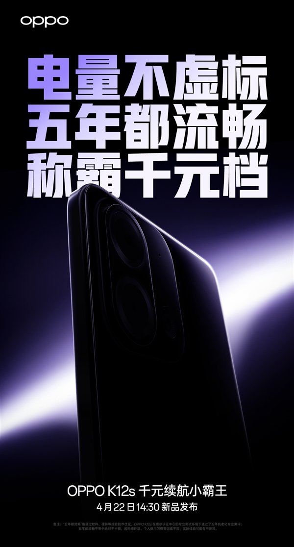 快科技4月17日消息,OPPO宣布将于4月22日14:30发布OPPO K12s,号称千元续航小霸王。海报显示,OPPO K12s电量不虚标,五年都流畅,称霸千元档。