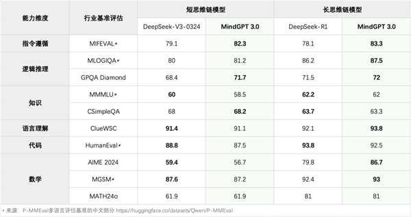 MindGPT 3.0最大的亮点就是支持了深度思考,性能对标DeepSeek-V3-0324(短思维链)及DeepSeek-R1(长思维链)。