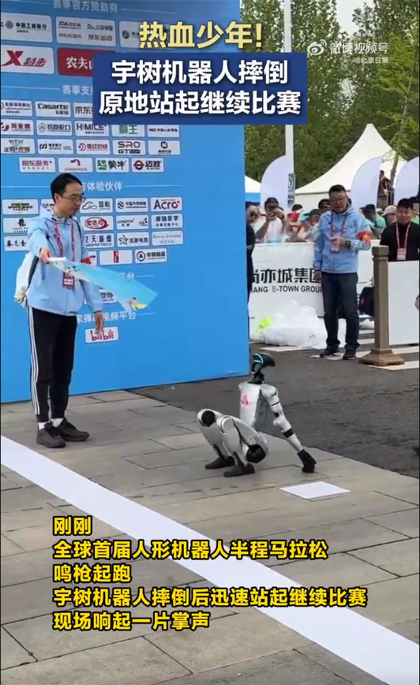 起跑阶段和赛程中,它多次摔倒在地,然而,凭借先进的强化学习算法和精心进行的适赛化改造,它总能迅速自主站立,重新投入比赛。