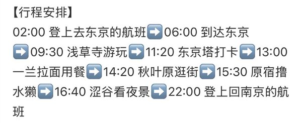 网友@PcyZhHng甚至亲测24h就足以逛完东京的五大景点,里面还包含了往返的航班时间。