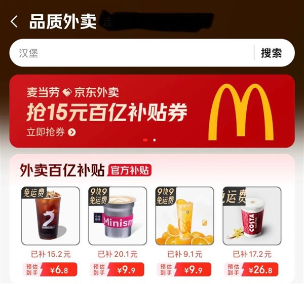 实际上,在百亿补贴号角吹响之前的一段时间,京东外卖就已经开始默默发券,随机发放满 20-5、满 8-7 的优惠券,有人可以 1 块钱喝到一杯奶茶,20 块钱吃到麦当劳四件套套餐。