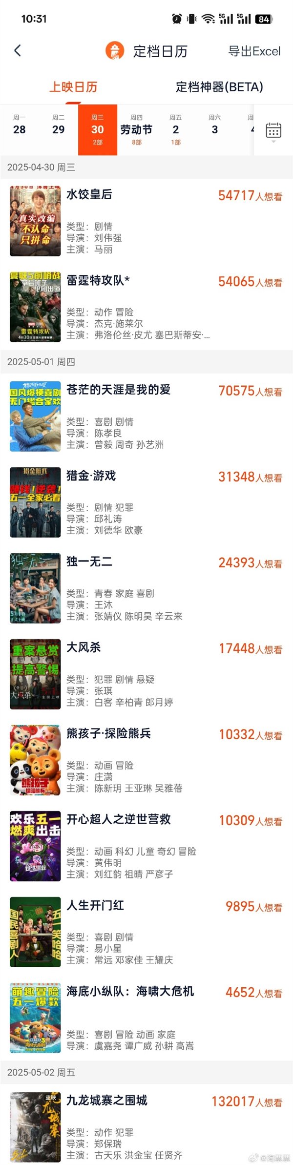 据灯塔专业版上映日历显示,截至当前已有11部电影定档2025五一档上映。